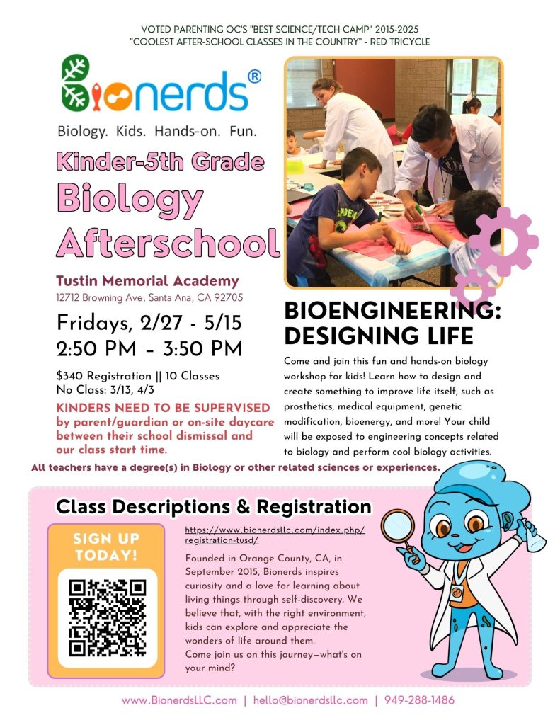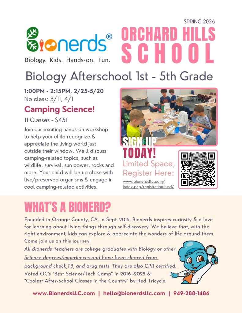 Winter 2026 Land and Water Creatures registration is OPEN. ACCEPT LATE REGISTRATION, please contact admin@bionerdsllc.com or 949-288-1486 after the first class to register with prorated fee. Thank you.
